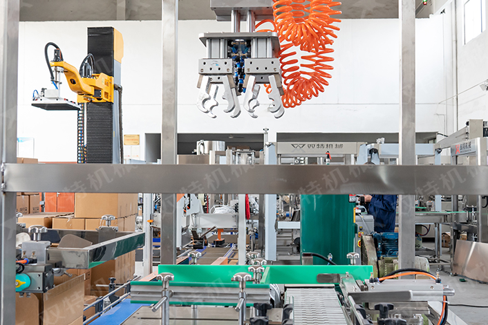 機器人碼垛系統主要針對包裝線的后道碼垛而設計,機器本身占地小,重量輕,功能全面,可以再不同的環境下使用。